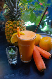 Naranja, pepino, espinaca, apio y nopal, manzana, naranja y espinaca, piña, zanahoria, naranja, jengibre y menta, jugo de la casa